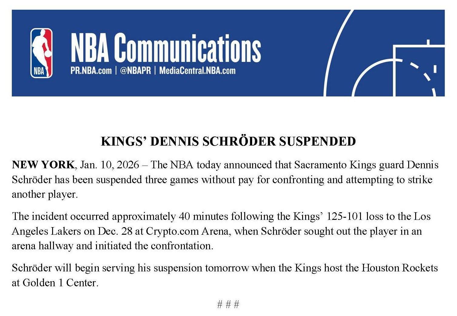 官方:施罗德由于试图在赛后殴打湖人球员,被禁赛三场 24直播网 2026-01-12 06:14:00 阅读模式 一键直击直播 高清直播(看球热门) 官方:施罗德由于试图在赛后殴打湖人球员,被禁赛三场 直播 4k超清推荐 北京时间1月11日,NBA官方发布公告,国王球员施罗德被禁赛3场。官方公告显示,施罗德在12月29日国王和湖人的比赛结束约40分钟后,在湖人主场球馆的走廊主动找到一名湖人球员并发生了冲突。在比赛中,施罗德和东契奇在场上曾发生口角。