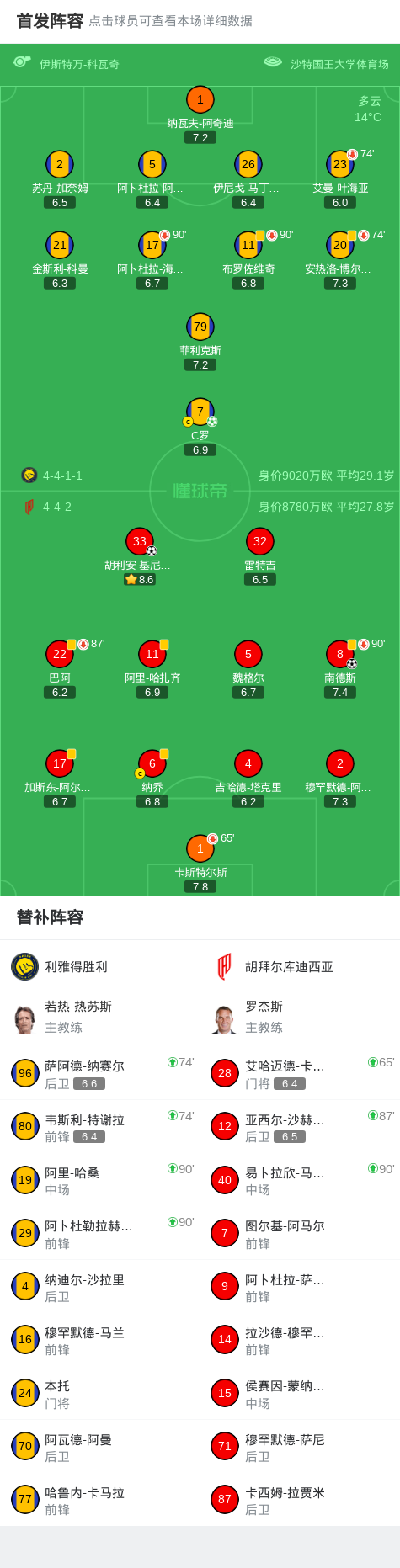 利雅得胜利1-2胡拜尔库迪西亚,C罗点射,南德斯建功